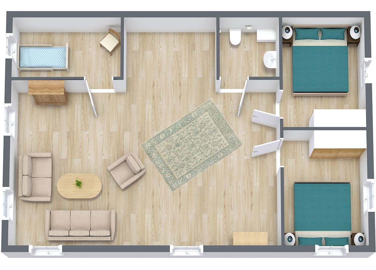 befindet sich ein Schlafzimmer, Küche, Wohnzimmer und ein Badezimmer mit Dusche