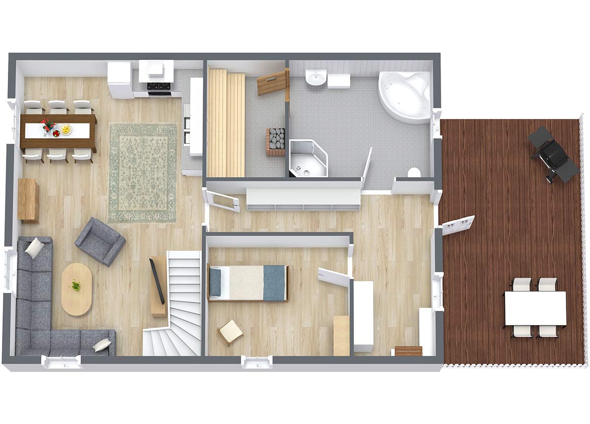 Whirlpool und Sauna. Auf der zweiten Etage befinden sich zwei Schlafzimmer und